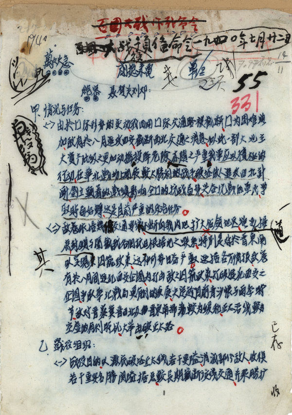 為粉碎侵華日軍的“囚籠政策”、遏制國民黨頑固派的妥協(xié)投降逆流,1940年8月至翌年1月,中國共產(chǎn)黨領(lǐng)導(dǎo)的八路軍在華北發(fā)動(dòng)了百團(tuán)大戰(zhàn)。百團(tuán)大戰(zhàn)第一階段以破襲正太鐵路為重點(diǎn),這是1940年7月22日簽發(fā)的破襲正太路戰(zhàn)役預(yù)備命令(中央檔案館提供)。