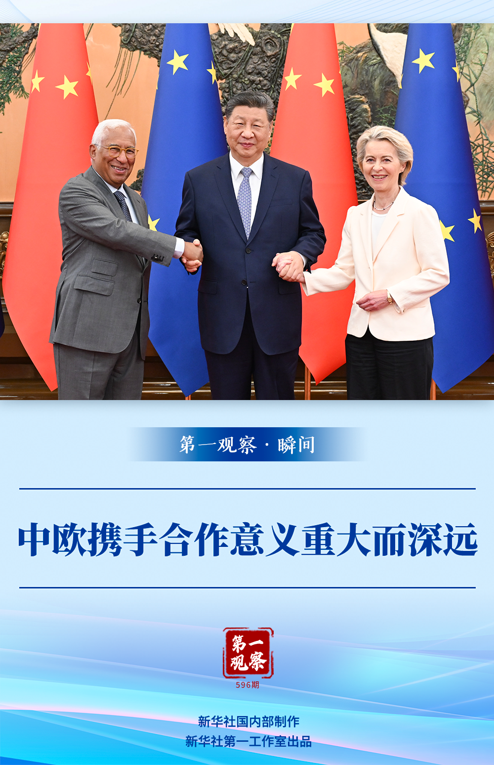 會見開始前的合影環(huán)節(jié),科斯塔主席、馮德萊恩主席主動(dòng)向習(xí)近平主席伸出右手,三位領(lǐng)導(dǎo)人微笑著攜手面向記者合影留念。