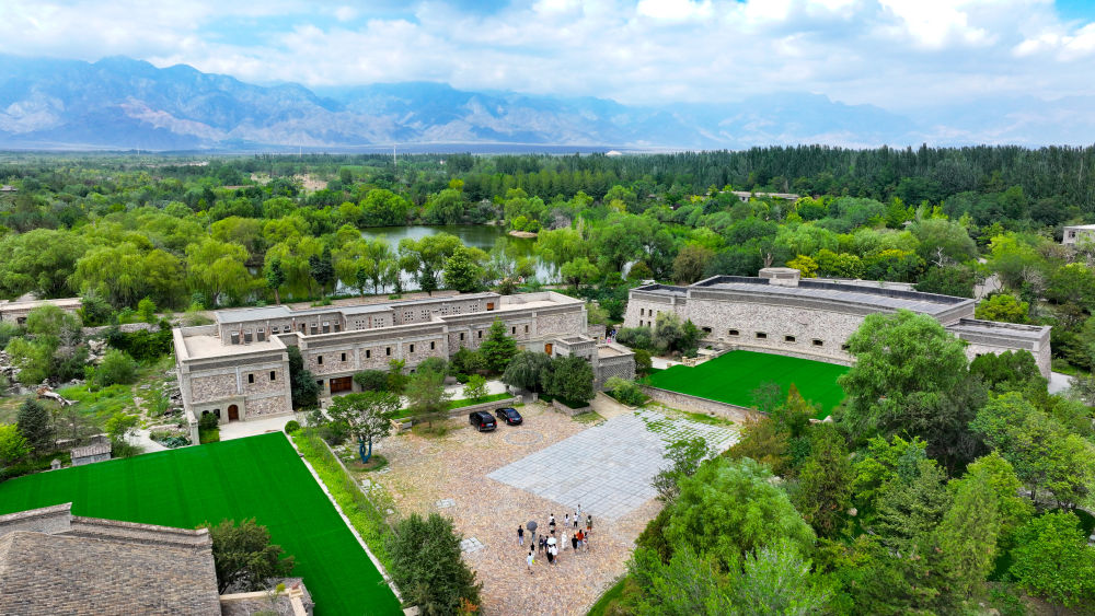 游客在寧夏銀川市西夏區(qū)鎮(zhèn)北堡鎮(zhèn)源石酒莊游玩(無(wú)人機(jī)照片,2024年8月7日攝)。新華社記者 馮開(kāi)華 攝