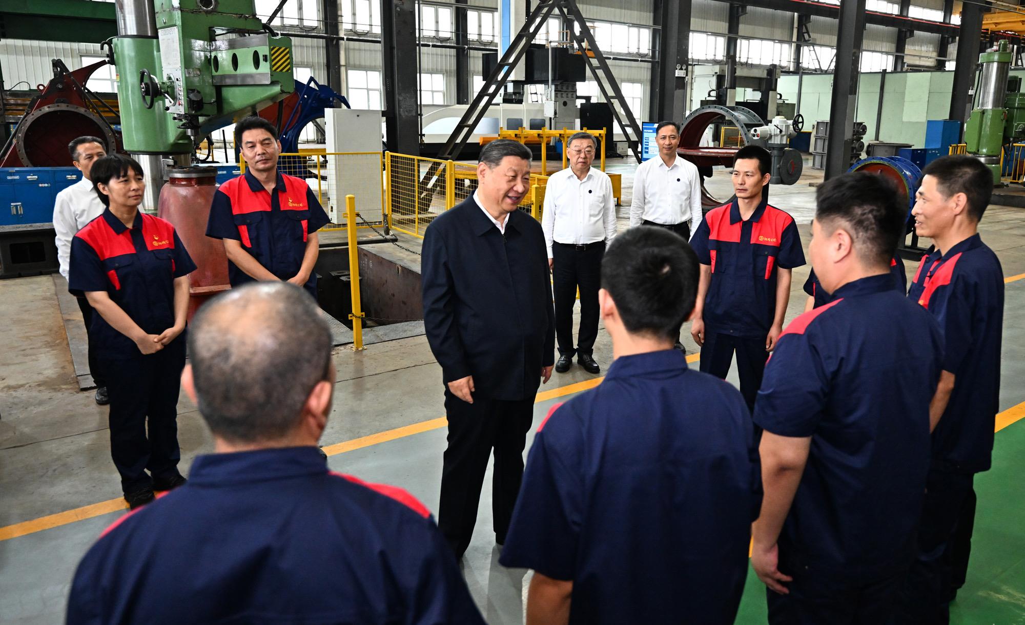 2025年7月7日,習(xí)近平總書(shū)記在山西陽(yáng)泉閥門股份有限公司考察時(shí),同企業(yè)員工親切交流。