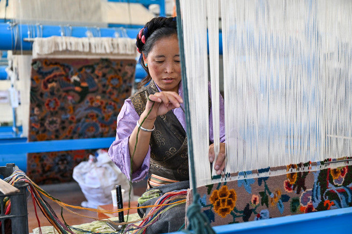 2025年7月18日,江孜藏毯文化發(fā)展有限責(zé)任公司的員工在生產(chǎn)車間內(nèi)編織藏毯。西藏日喀則市江孜縣是著名的藏毯(藏族稱為“卡墊”)之鄉(xiāng),織毯歷史悠久。藏族卡墊織造技藝于2006年被列入國家級(jí)非物質(zhì)文化遺產(chǎn)代表性項(xiàng)目名錄。近年來,江孜藏毯在守護(hù)傳統(tǒng)技藝的同時(shí)積極創(chuàng)新,通過建立合作社、開辦技能培訓(xùn)班等方式擴(kuò)大靈活就業(yè)規(guī)模,讓更多人在家門口織藏毯增收。