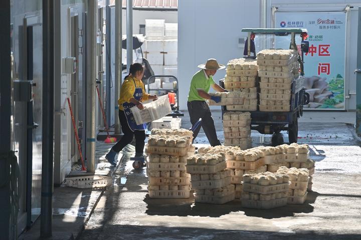 2024年10月31日,村民在廣西百色市德??h那造村食用菌生產(chǎn)基地搬運(yùn)采摘的蘑菇。那造村通過做優(yōu)特色產(chǎn)業(yè)、豐富村民生活、完善基礎(chǔ)設(shè)施等多項(xiàng)具體舉措,推動(dòng)各項(xiàng)事業(yè)快速發(fā)展。