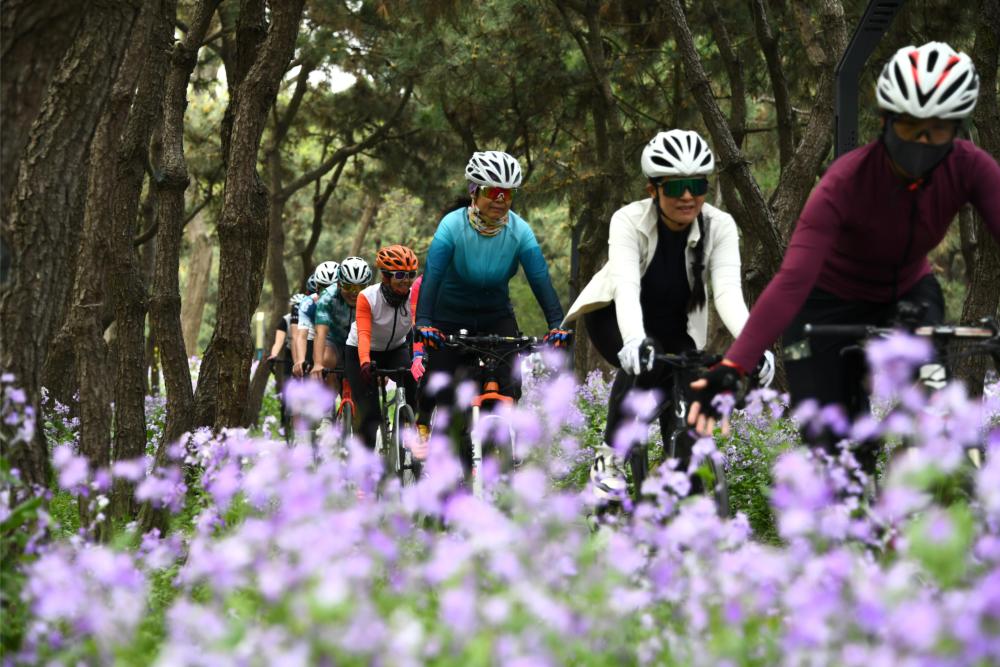 2025年4月19日,自行車運(yùn)動愛好者在山東日照的海濱騎行綠道騎行。
