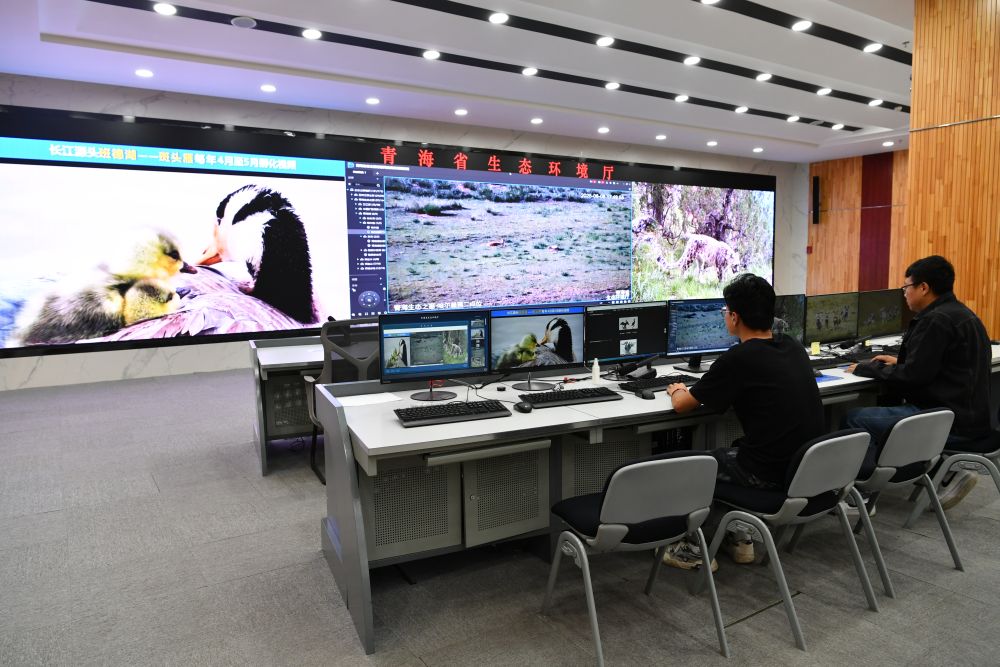 8月8日,青海省生態(tài)環(huán)境廳信息中心工作人員正在分析野生動(dòng)物監(jiān)測畫面。(劉紅 攝)