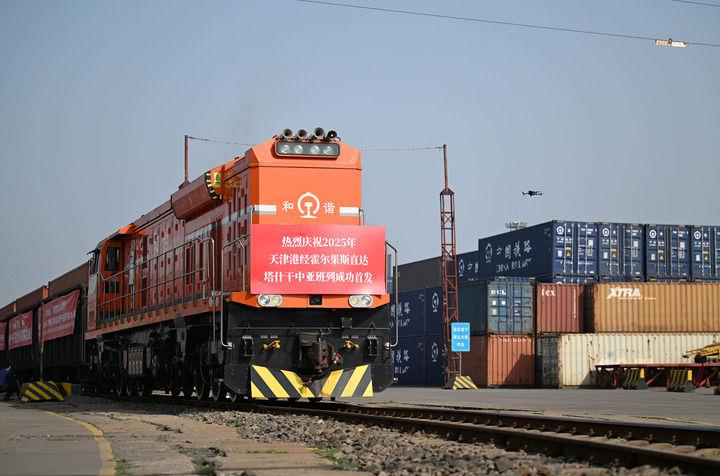 △2025年5月20日,2025年首列天津港經(jīng)霍爾果斯直達塔什干的中亞班列從天津港物捷三堆場發(fā)車。