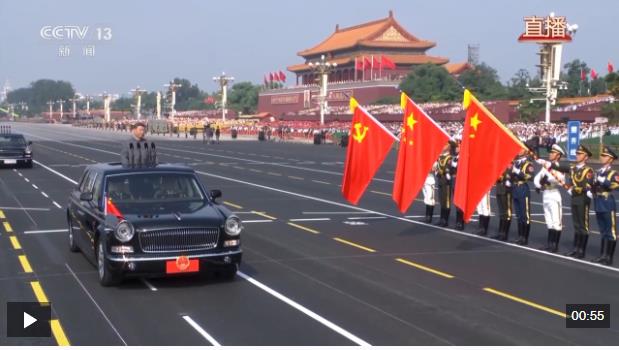 偉大旗幟光耀千秋。中國(guó)共產(chǎn)黨黨旗、中華人民共和國(guó)國(guó)旗、中國(guó)人民解放軍軍旗在受閱部隊(duì)最前方迎風(fēng)招展。檢閱車(chē)行進(jìn)至黨旗、國(guó)旗、軍旗前,敬禮號(hào)角響起,習(xí)近平停車(chē)肅立,以注目禮向三面旗幟莊嚴(yán)致敬。