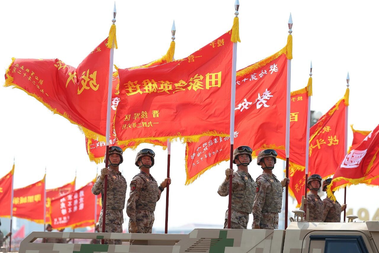 80面抗戰(zhàn)英模部隊(duì)榮譽(yù)旗幟組成戰(zhàn)旗方隊(duì)