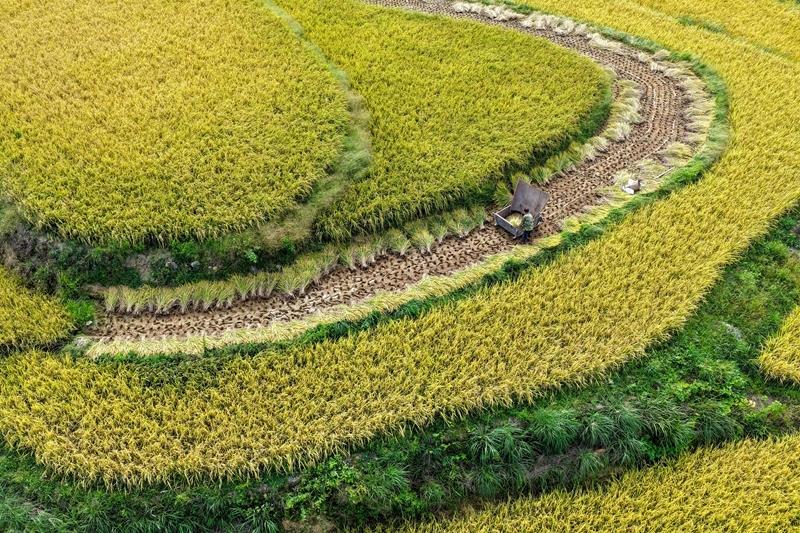 2025年9月18日,稻農(nóng)在重慶黔江區(qū)五里鎮(zhèn)的稻田里搶收稻谷。