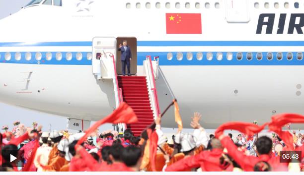 在機(jī)場(chǎng),各族群眾代表身著民族服飾,載歌載舞。從機(jī)場(chǎng)到住地,各族群眾手持紅旗,熱情歡呼,表達(dá)對(duì)總書記的歡迎和感激之情。