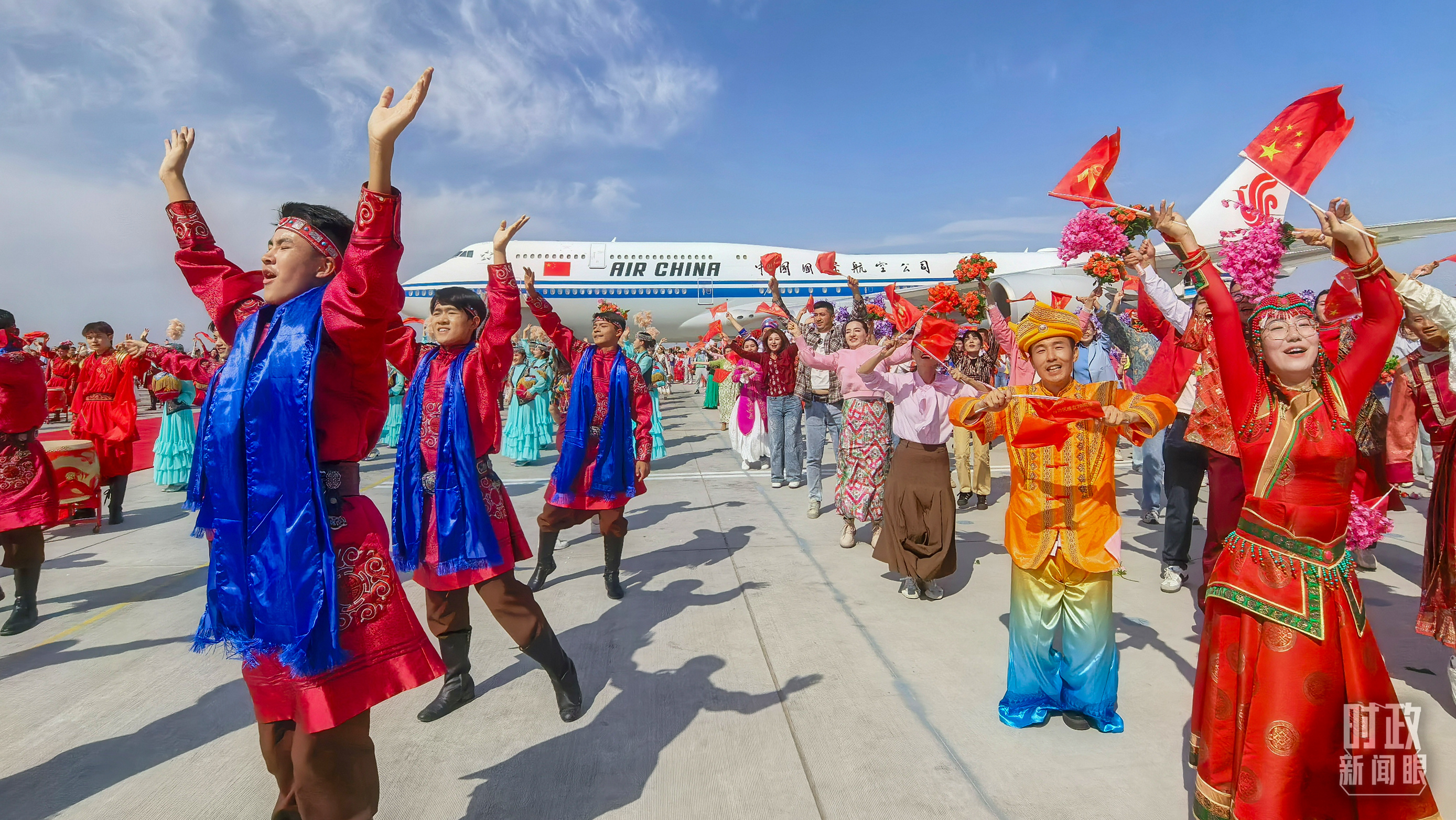 23日下午,烏魯木齊天山國(guó)際機(jī)場(chǎng)鼓樂喧天。總書記乘坐的專機(jī)在機(jī)場(chǎng)降落,等候在停機(jī)坪的新疆各族各界群眾熱烈歡呼。