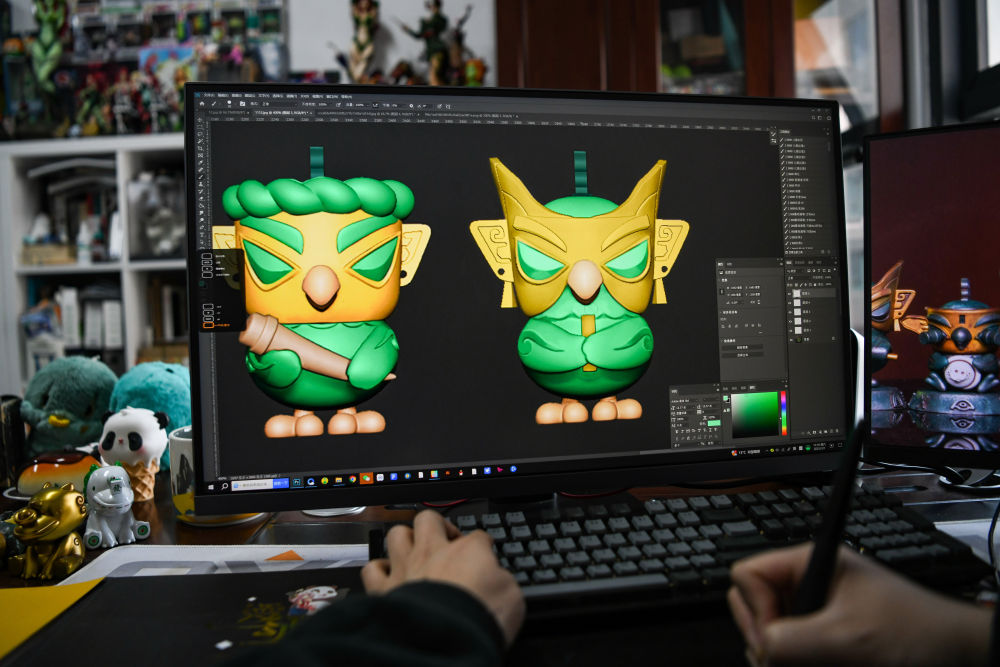 2025年3月1日,文創(chuàng)產(chǎn)品策劃運(yùn)營師曾舟在位于四川成都的辦公室內(nèi)完善文創(chuàng)產(chǎn)品細(xì)節(jié)。他以三星堆青銅神樹、青銅縱目面具、青銅獸面等文物為創(chuàng)作藍(lán)本,結(jié)合潮玩元素設(shè)計(jì)的文創(chuàng)作品廣受歡迎?!拔蚁胱龅牟皇峭婢呖煜罚怯袃?nèi)容、有溫度、有意義的文化IP,讓年輕一代隨手摸到沉淀千年的文化?!痹壅f。