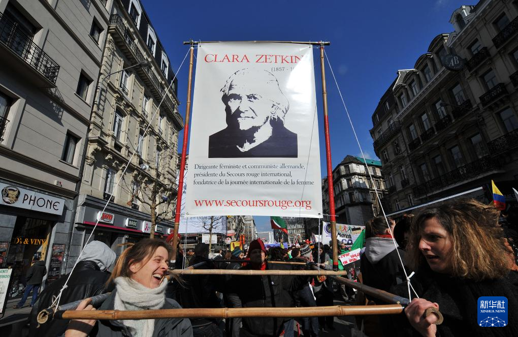 2010年3月6日,在比利時(shí)首都布魯塞爾,婦女代表抬著著名女政治活動(dòng)家、三八國際婦女節(jié)的倡導(dǎo)者克拉拉·蔡特金的畫像參加慶祝三八國際勞動(dòng)?jì)D女節(jié)游行。新華社記者 武巍 攝