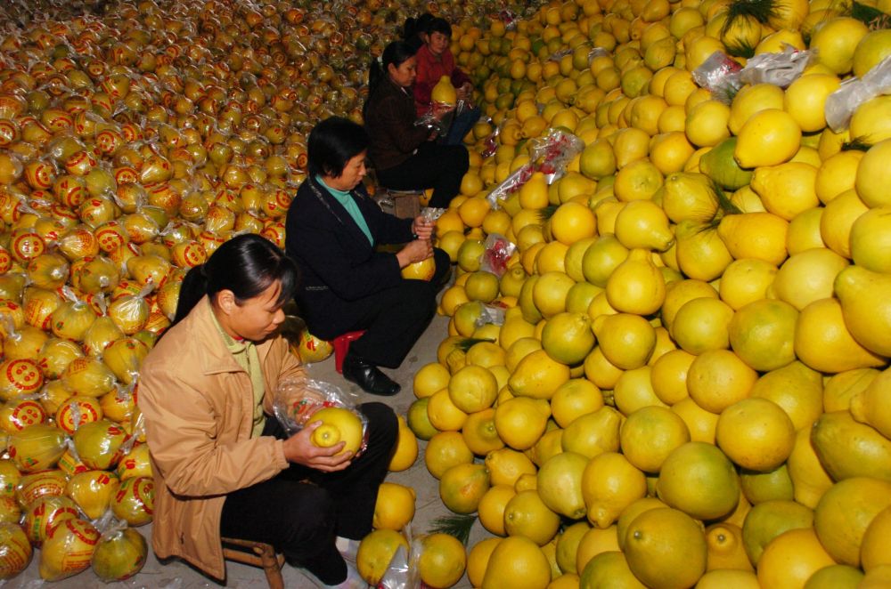 2007年12月1日,廣東省梅縣農(nóng)民在包裝柚子。