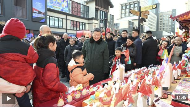 總書記察看街區(qū)風(fēng)貌和各式年貨攤位,同現(xiàn)場群眾親切交流。他愉快地向大家講起年少時多次到隆福寺的情景,還購買了特色食品和文創(chuàng)產(chǎn)品。