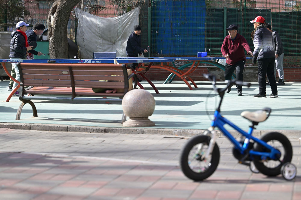 社區(qū)內(nèi),利用樓群間空地設(shè)置的乒乓球臺等健身設(shè)施為附近的老年居民提供了便捷的健身場所(2月10日攝)。