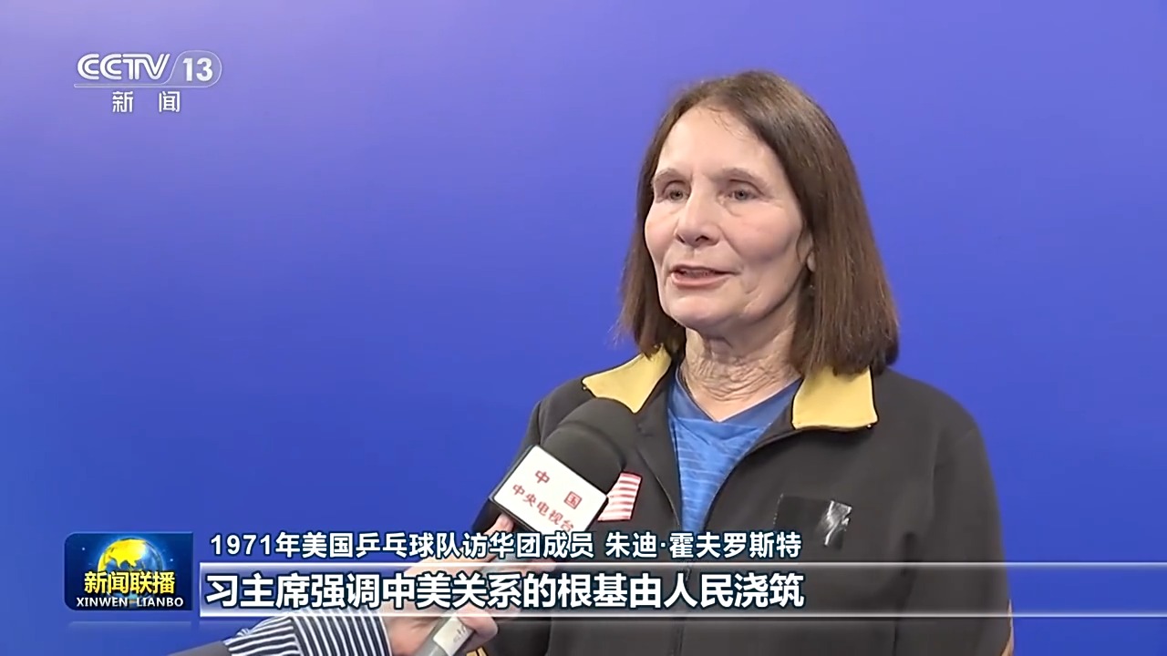 1971年美國乒乓球隊訪華團(tuán)成員 朱迪·霍夫羅斯特:習(xí)主席強調(diào)中美關(guān)系的根基由人民澆筑,這一點我深有感觸。在當(dāng)下,相互理解與對話比任何時候都更加重要,我也希望我們能將“乒乓外交”精神繼續(xù)傳承,在兩國人民間傳遞溫情,增進(jìn)理解。