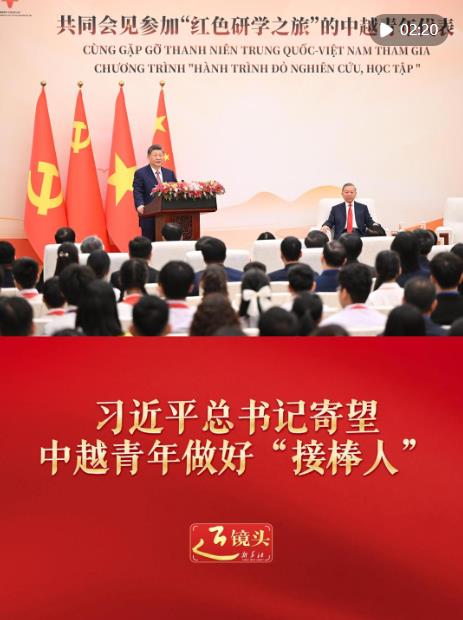 2025年4月15日,對(duì)越南進(jìn)行國(guó)事訪問(wèn)期間,習(xí)近平總書(shū)記在會(huì)見(jiàn)中越人民大聯(lián)歡活動(dòng)代表時(shí)宣布,中方將在今后3年邀請(qǐng)?jiān)侥锨嗄旮叭A開(kāi)展“紅色研學(xué)之旅”。一年來(lái),已有1000余名越南各界青年與中國(guó)青年一道,沿著兩黨兩國(guó)老一輩領(lǐng)導(dǎo)人的革命足跡,共同探尋中越友好的紅色基因,感受中國(guó)式現(xiàn)代化的萬(wàn)千氣象。