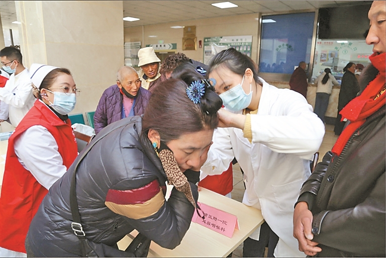 圖為醫(yī)療隊專家為患者做耳部疾病檢查。記者 貢秋曲措 通訊員 梁俠 潘樹仁 攝