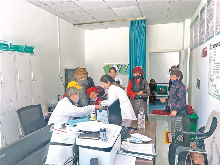 圖為瓊結(jié)縣拉玉鄉(xiāng)衛(wèi)生院醫(yī)護(hù)人員在為群眾看病。