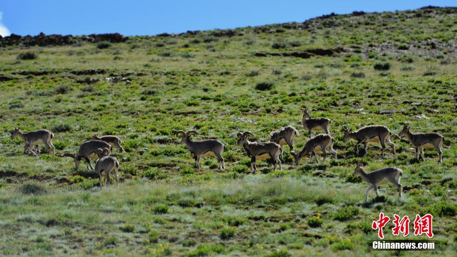9月2日,多只藏原羚和巖羊在西藏山南羊卓雍錯湖畔覓食。當(dāng)?shù)亟陙聿粩嗉哟蟊Wo力度,環(huán)境日益趨好,野生動物種群正在逐漸恢復(fù)、增長。中新社記者 江飛波 攝