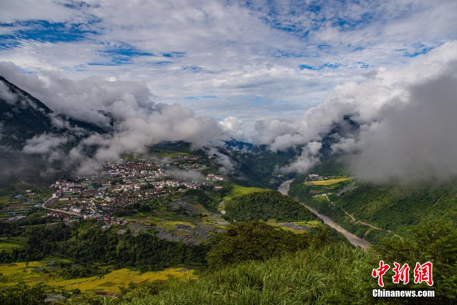 圖為云霧繚繞的墨脫縣城。何蓬磊 攝
