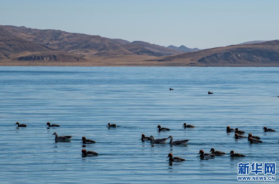這是1月10日拍攝的羊卓雍錯(cuò)湖面上的水鳥。新華社記者 孫非 攝