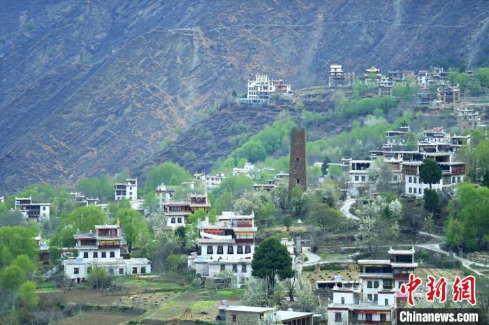 山坡上一幢幢藏式樓房灑落在梨花、綠樹(shù)叢中美如畫。劉忠俊 攝