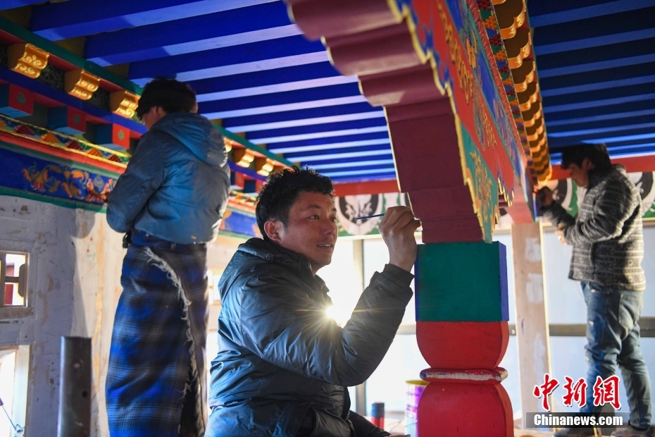 12月28日,西藏拉薩堆龍德慶區(qū),古俗民族傳統(tǒng)手工藝發(fā)展專(zhuān)業(yè)合作社員工在房屋上繪制藏式裝飾。據(jù)悉,該合作社以繪畫(huà)、木工、縫紉為主,承接傳統(tǒng)手工藝方式制作家具、房子裝修、唐卡繪畫(huà)、旅游產(chǎn)品、文物建筑維修等工作。自2018年合作社成立至今,帶動(dòng)就業(yè)共60余人。 中新社記者 貢嘎來(lái)松 攝