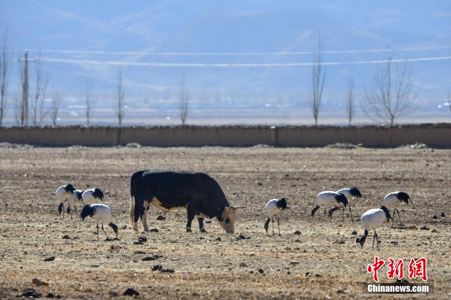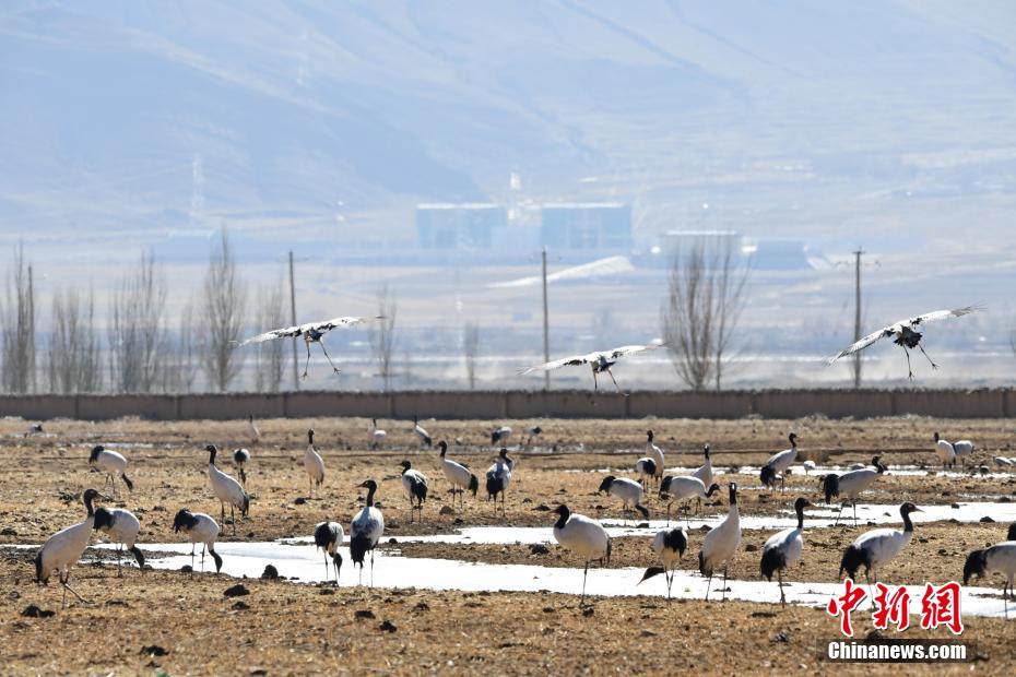 每年的10月底,成群的黑頸鶴飛到西藏拉薩市林周縣越冬,在拉薩市林周縣周邊的湖泊濕地度過5個月的“閑云野鶴”生活,次年三四月份再飛向藏北草原繁殖。黑頸鶴是世界上唯一一種高原鶴類。具有足長、喙長、頸長的典型涉禽類特征,適合在沼澤地里行走。黑頸鶴的頸、尾為黑色,體羽為灰白色。黑頸鶴是國家一級保護動物。目前,每年到林周縣越冬的黑頸鶴已達2000只左右。圖為黑頸鶴在林周境內的農田里覓食、嬉戲。 貢嘎來松 攝