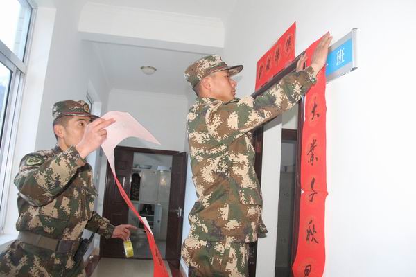 圖為戰(zhàn)士們貼春聯(lián)迎新春