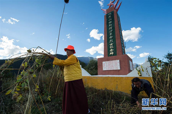 圖為頂果山寺第39世活佛丹貝降參(左),繼承前世活佛對(duì)紅軍的深情厚誼,堅(jiān)持尋找、精心收藏當(dāng)年紅軍的戰(zhàn)斗遺物和文物,維護(hù)著頂果山格勒得沙革命烈士紀(jì)念碑。