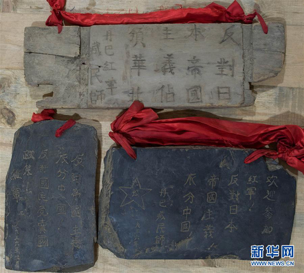頂果山寺活佛丹貝降參收藏的當(dāng)年紅軍留下的寫有“歡迎參加紅軍!反對(duì)日本帝國(guó)主義瓜分中國(guó)!”字樣的木刻石刻宣傳標(biāo)語(yǔ)。