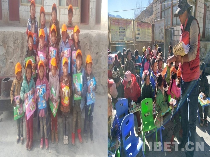 駐村隊(duì)長(zhǎng)次仁扎西向孩子們發(fā)放學(xué)習(xí)用品