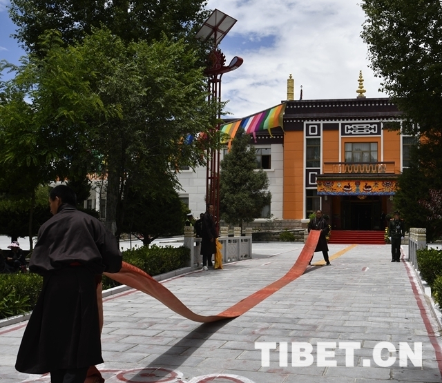 在位于拉薩市區(qū)的班禪行宮雪林多吉頗章大院內(nèi),一場(chǎng)更加熱烈的儀式也即將進(jìn)行。在雪林多吉頗章主殿前,僧人們提前繪制了金剛結(jié)等吉祥圖案,一條尺許寬的地毯從歡迎隊(duì)伍處一直延伸到主殿門前。來自拉薩各大寺廟的僧眾代表和拉薩信教群眾代表,帶著虔誠(chéng)和喜悅的心情,翹首以盼十一世班禪的到來。