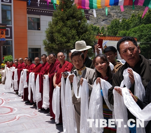 當(dāng)大院內(nèi)響起法號(hào)聲時(shí),早已在此等候的僧俗信教群眾紛紛翹首踮足,盼望一睹十一世班禪的風(fēng)采。十一世班禪剛下車,高僧們手持香爐,打著幡幛、華蓋,吹奏佛樂,以藏傳佛教最隆重的禮儀迎接班禪額爾德尼?確吉杰布的到來。身著藏族傳統(tǒng)盛裝的男女青年,向十一世班禪敬獻(xiàn)象征吉祥如意的“切瑪”,表達(dá)拉薩各族各界人士和僧俗信教群眾的美好祝愿。在此等候的自治區(qū)有關(guān)領(lǐng)導(dǎo)也與十一世班禪互敬哈達(dá)、互致問候。