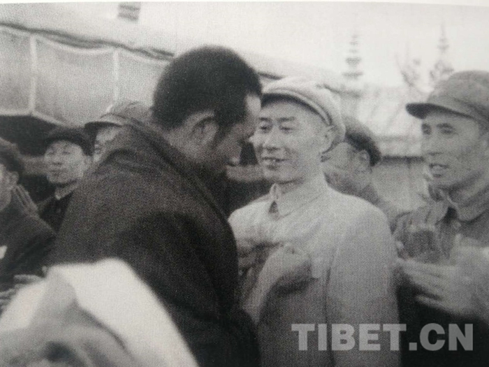1952年4月28日,十世班禪額爾德尼?確吉堅(jiān)贊及其堪布會議廳委員會全體人員從青海返回西藏,到達(dá)拉薩。張經(jīng)武和人民解放軍駐拉薩機(jī)關(guān)、部隊(duì)、西藏地方政府各級官員、西藏地方部隊(duì),三大寺喇嘛、拉薩市僧俗群眾等兩萬多人迎接。圖為張經(jīng)武和十世班禪的合影。
