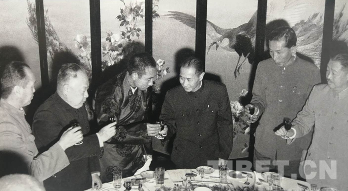 圖為1959年4月29日,中央駐藏代表張經(jīng)武在北京飯店舉行宴會,慶祝西藏自治區(qū)籌備委員會成立三周年。右起:賀龍、阿沛?阿旺晉美、張經(jīng)武、十世班禪、陳毅、烏蘭夫。