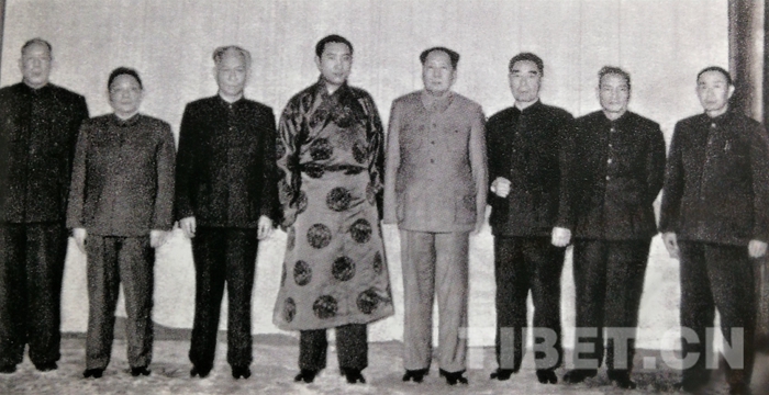 圖為1961年1月23日,毛澤東主席和中央領(lǐng)導(dǎo)接見十世班禪時的合影。圖中左起:李維漢、鄧小平、劉少奇、十世班禪、毛澤東、周恩來、陳云、張經(jīng)武。(中國西藏網(wǎng) 記者/孔夏 圖片翻拍自由中共黨史出版社出版的書籍《張經(jīng)武與西藏解放事業(yè)》)