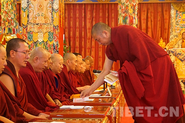 圖為土多申格副院長帶領經(jīng)師代表和學員代表,虔誠地向十一世班禪敬獻曼扎、佛像、佛塔、佛經(jīng)。攝影:孫健