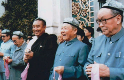 圖為習(xí)仲勛(右二)與烏蘭夫(右一)、十世班禪(右三)、賽福鼎?艾則孜(右四)、楊靜仁(右五)在北京民族文化宮。圖片來源:《中國西藏》雜志