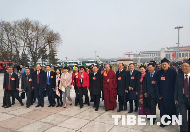 圖為全國政協委員達扎?尕讓托布旦拉西降措與其他全國政協委員一起入場