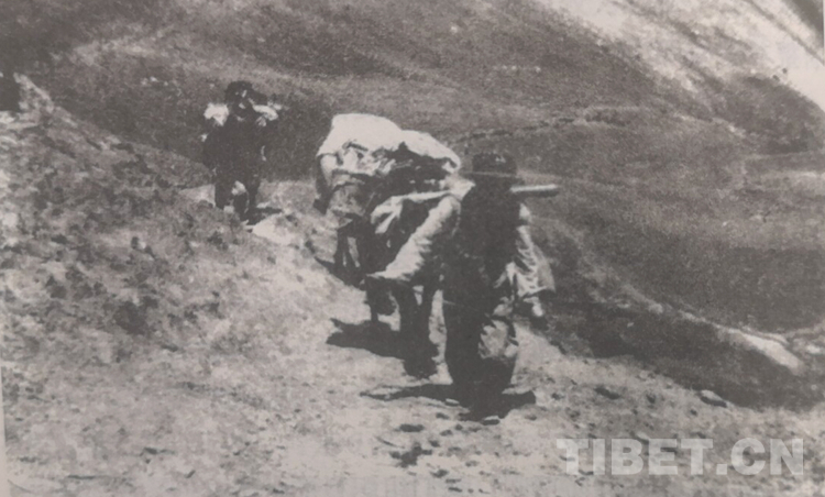 康藏工作隊的30個人分成了三個分隊,每一個分隊又分三個組,一個組負(fù)責(zé)搭帳篷,一個組負(fù)責(zé)放牛,一個組負(fù)責(zé)做飯。李國柱被分到了炊事組,專門給班里的戰(zhàn)士們做飯。“炊事用具都由我背,糧食大家分頭背。沒有灶,三塊石頭一搭就是灶。那時候吃飯很簡單,沒有什么菜,就是一點干菜,用水泡發(fā)后煮一煮,再就是煮點米吃,后來米也沒有了,只有野菜,或是煮一些死牦牛的肉,因為柴火太少,也煮不爛,大家吃得牙齒都不好了。那時燒柴困難,一到宿營地,大家就分頭去拾牛糞和樹枝,但這些都不夠干,不容易點著。于是我就每天跪在地上不停地吹,煙熏得眼睛周圍到處都是,本來就有慢性喉炎,長期受凍、煙熏,導(dǎo)致嗓子一路都是嘶啞的。走一路,總是跪在地上吹火,僅有的一身衣服的棉花都是開著的,全部磨爛了。”