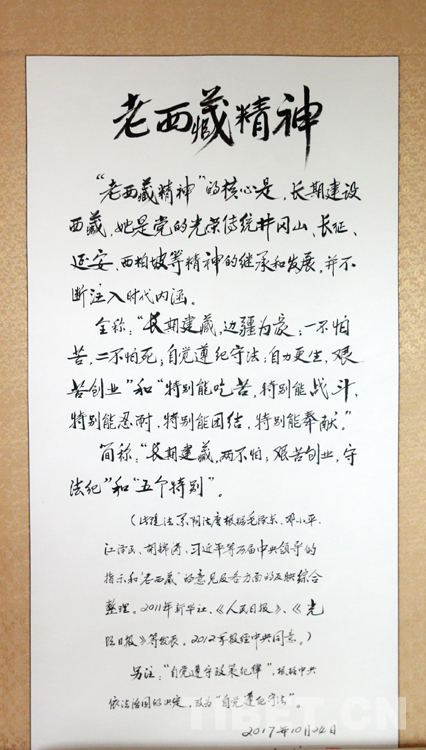 圖為陰法唐、李國柱家中懸掛的“老西藏精神”內(nèi)涵書法作品。