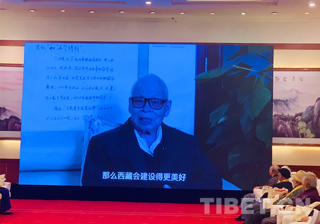 圖為原西藏自治區(qū)原黨委第一書記、十八軍52師副政委陰法唐同志視頻發(fā)言。