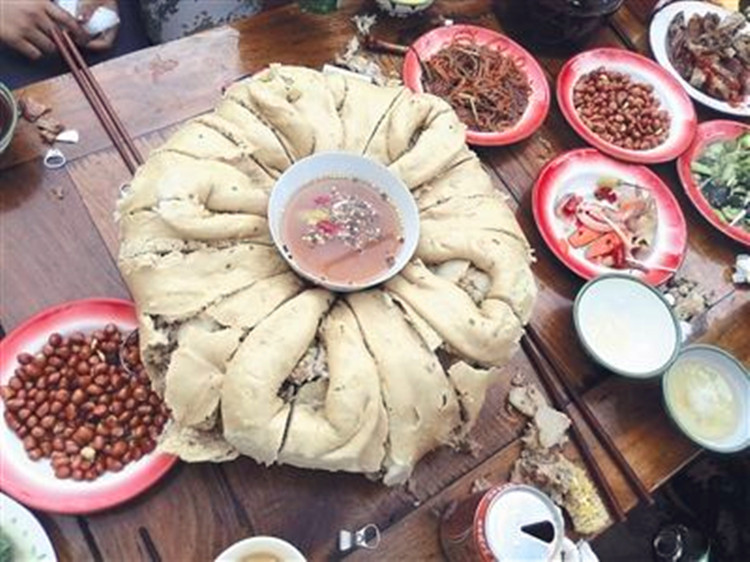 吃“團(tuán)結(jié)包子”時(shí),進(jìn)餐的人們圍坐在一起,把冒著騰騰熱氣、散發(fā)著濃濃香味的包子擺在桌子中央,然后每人面前放上一個(gè)小碟子,碟子里盛上蘸水。除此之外,還要打出一壺濃釅的酥油茶。