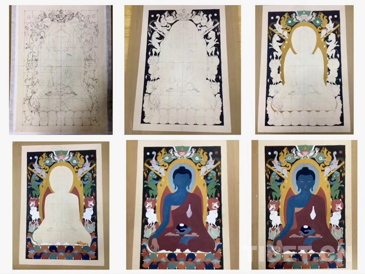 第三步:素描及設(shè)色。素描輪廓的依據(jù)是“圣跡圖像學(xué)”,那是圣賢們?cè)谮は胫杏^想到的各種神祗的容貌、各種神獸的形象,并記錄下來匯集成冊(cè)。畫師必須嚴(yán)格按照上面記載的人物樣貌、裝飾物、顏色來作畫,就連各種神獸所在的位置也完全不能有誤。
