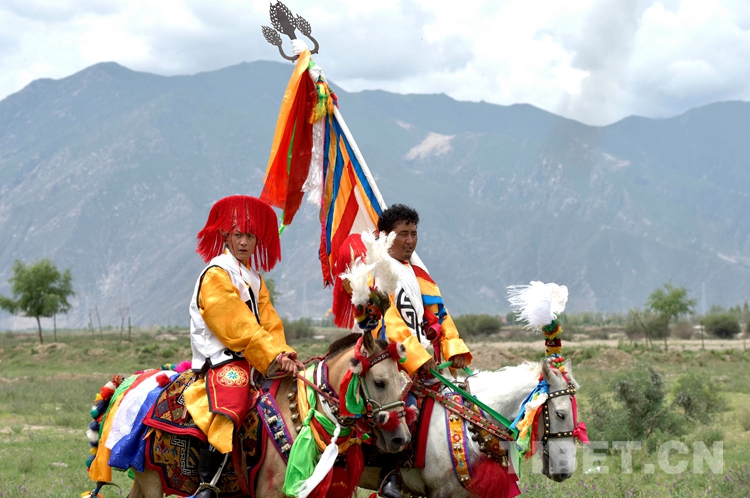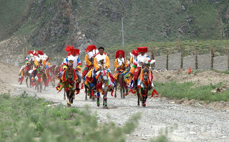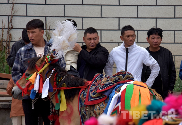頭戴紅色瓔珞圓帽、身穿繡有吉祥八寶的白色褂子,達(dá)瓦次仁嫻熟地借力馬鐙、一躍登上馬背。只見(jiàn)他雙腳蹬著馬鐙、右手不時(shí)揮動(dòng)著馬鞭,馭馬行走在村道上。扶老攜幼的村民們?cè)缫炎尦龅缆罚^望著遠(yuǎn)去的馬隊(duì)。