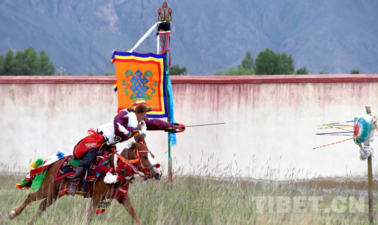第一位出場(chǎng)的騎手從容走馬,并且在馬背上做出后仰、側(cè)身等動(dòng)作,引得觀眾們一陣歡呼。表演時(shí),如果有騎手的帽子掉了或者從馬背上掉了下來(lái),則要接受次日喝酒的懲罰。兩輪走馬表演后,精彩的節(jié)目輪番登場(chǎng)。騎手們準(zhǔn)備好弓箭,準(zhǔn)備表演馬上射箭。