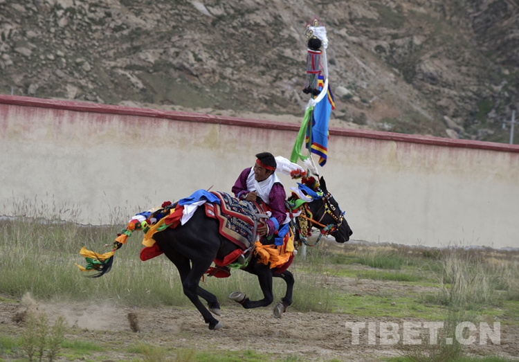 “拉康”里,一位僧人正在念經(jīng)祈禱;“拉康”外,騎手們和村里德高望重的老人們正在吟唱古老的民歌。一聲“杰杰嗦嗦,拉嗦啰”后,糌粑粉被高高拋撒,騎手們即將出發(fā)。