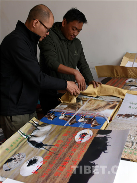 圖為雙湖縣副書記、中石油援藏干部胡勇(左)和雙湖縣森林公安局局長巴桑(右)在整理將要發(fā)放的保護(hù)野生動物的宣傳材料。(唐召明2017年7月27日攝)